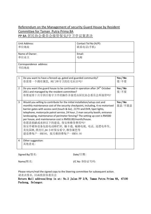RE: FORMATION OF RESIDENT ASSOCIATION AND REFERENDUM ON ENTRANCE GUARD HOUSE & SECURITY PERSONNEL SERVICE FOR TAMAN PUTRA PRIMA 8A