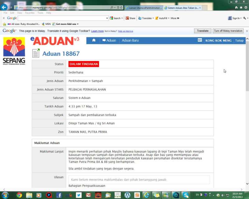 E-Aduan to MPSepang about open burning.