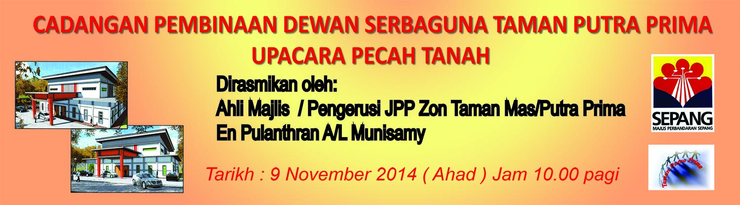 The ground-breaking ceremony was organised  by the Gabungan Persatuan Penduduk Taman Putra Prima to commemorate the achievement of the association and to celebrate for the realization of the long aspiring dream for a community hall. The call  for this amenity was raised by the Gabungan President Mr Kong during the last year Town Hall meeting initiated by Majlis Perbandaran Sepang Councillor Mr Pulanthran A/L Munisamy, who is also the Chairman of Jawatankuasa Perunding Penduduk (JPP) Zon Taman Mas–Putra Prima