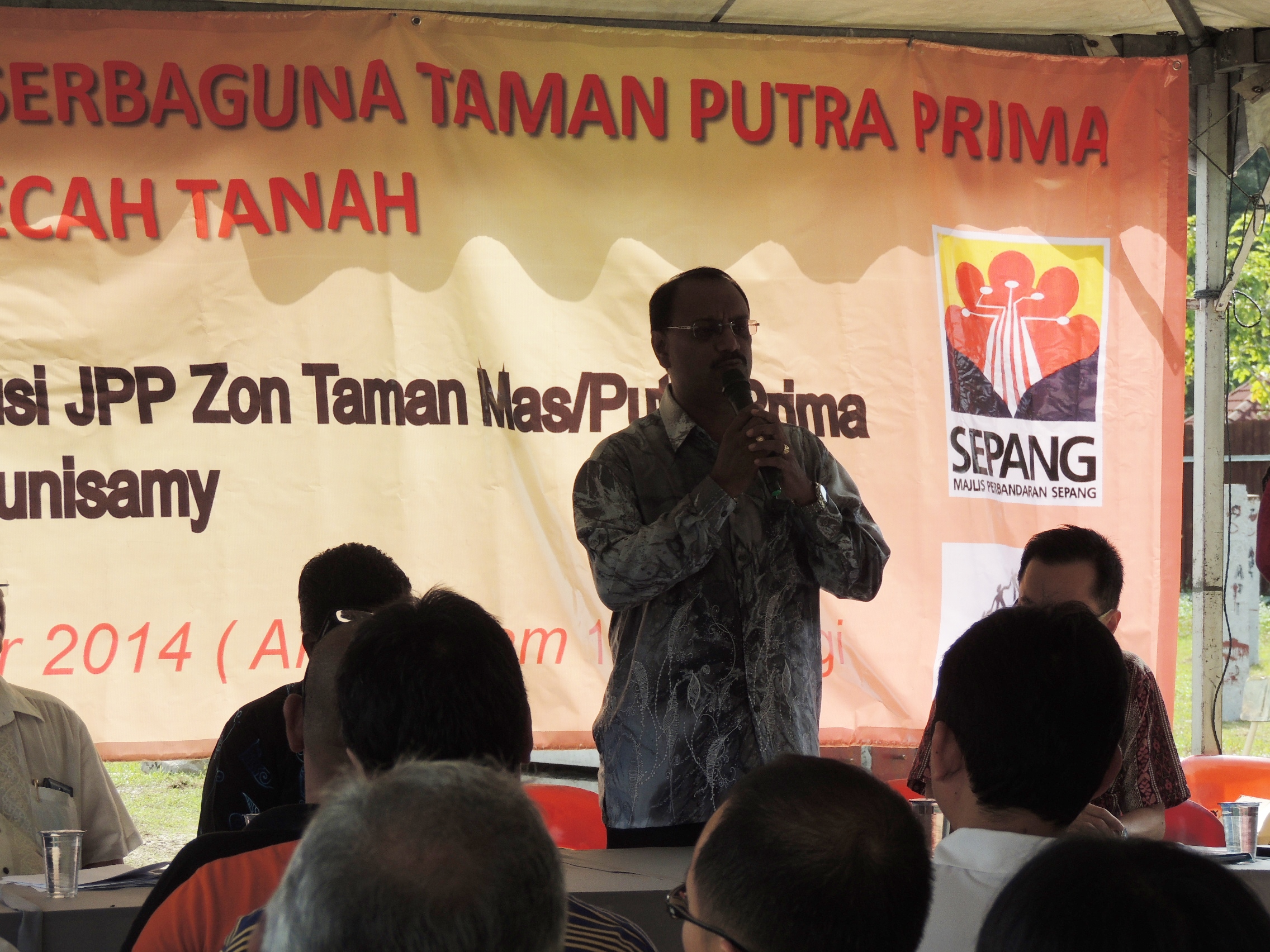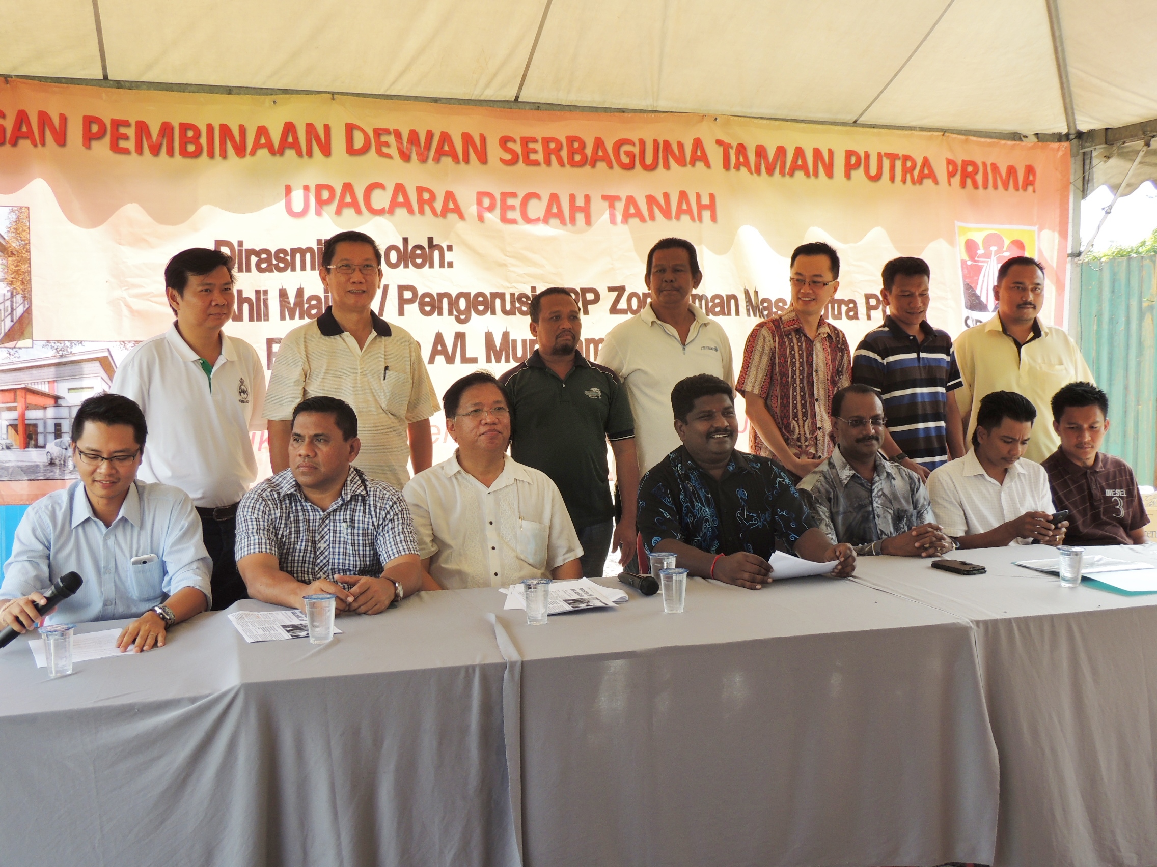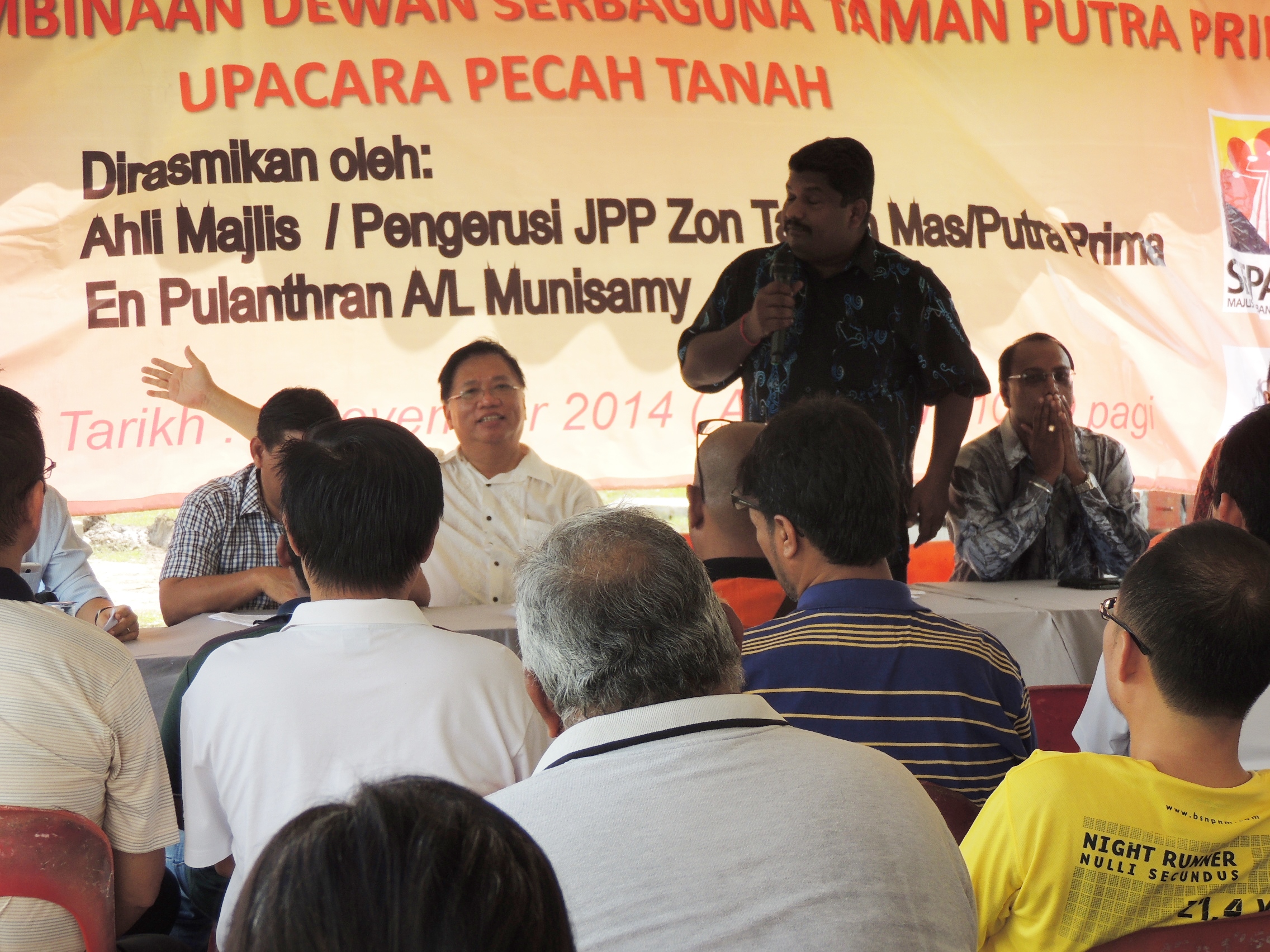 In order to express  the residents heartiest gratitude to the councillor for his dedication and assistance, the Gabungan had  invited Councillor Mr Pulanthran and his colleague Councillor Mr Santokh Singh  to officiate the ground breaking ceremony, other VIPs also invited to witness the event including The GM from the developer Plenitude Permai Sdn Bhd Mr Choy Chang Yee,  Ketua Balai Polis Tmn Putra Prima S/Isp Aziz Ali, , officers from MPSepang, RA  chairmen, committee members and representatives from various phases of Taman Putra Prima and the neighbouring Taman Mas,  Taman Sri Aman, Taman Meranti Jaya and Taman Lake Vista.