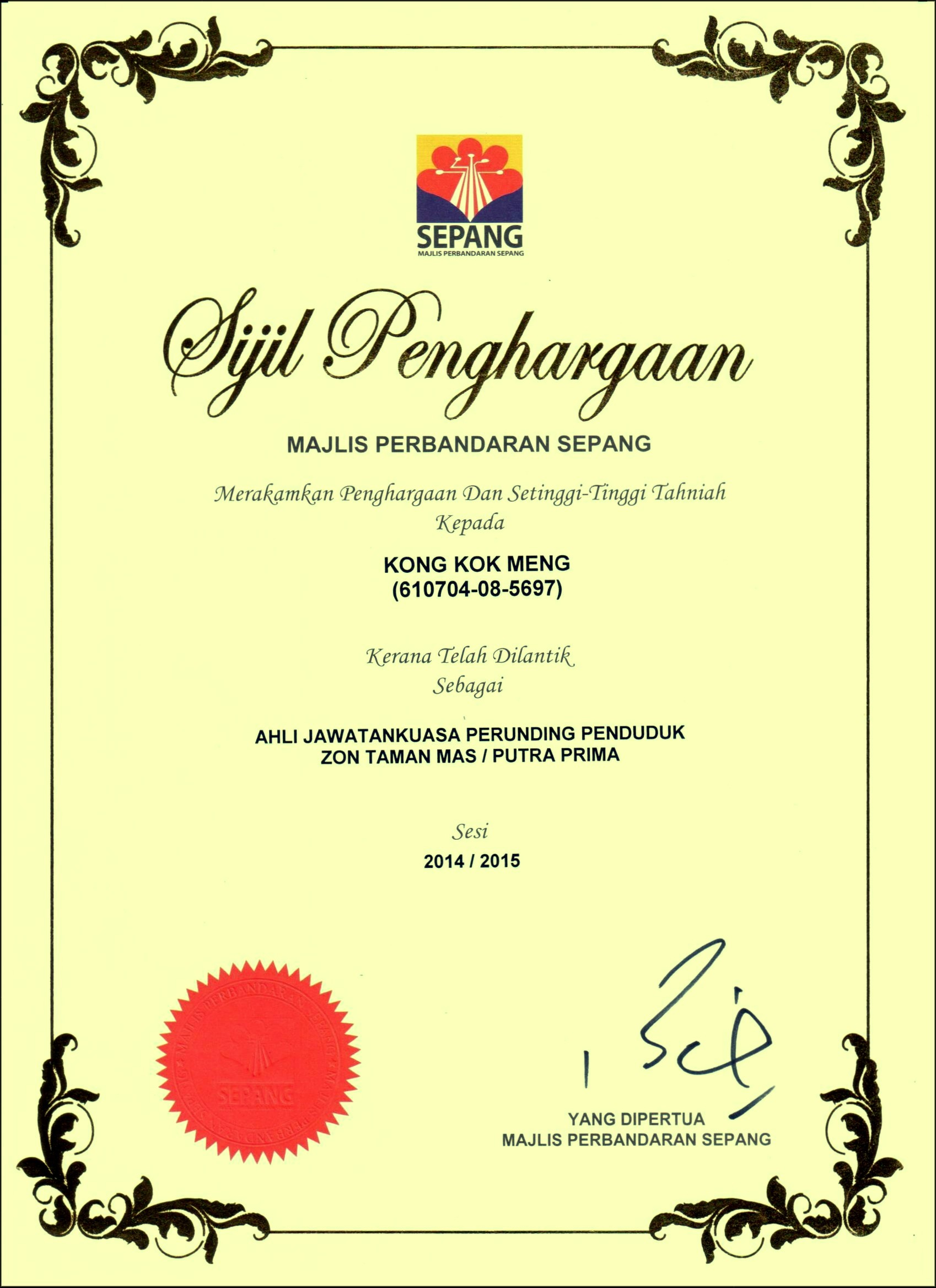 JPP Taman Mas-Putra Prima Received Appreciation Certificates in Conjuction with MPSepang 10th Year Anniversary Function