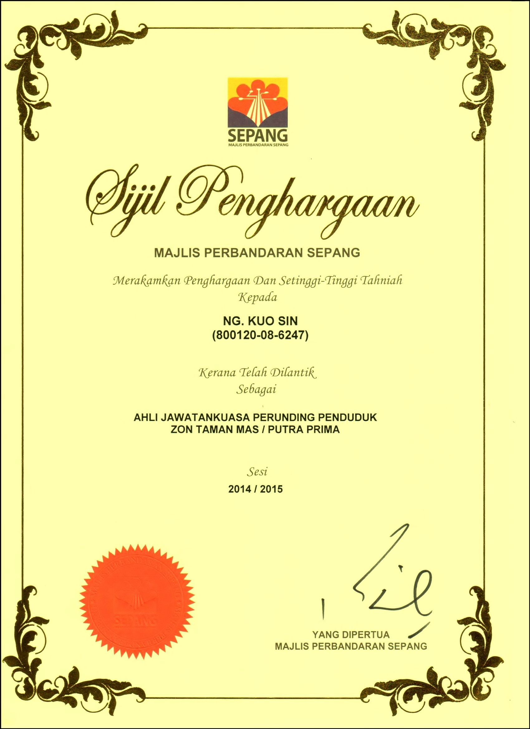 JPP Taman Mas-Putra Prima Received Appreciation Certificates in Conjuction with MPSepang 10th Year Anniversary Function