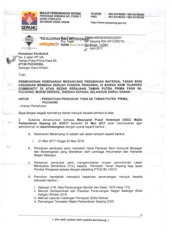 TPP8A Gated and Guarded Community Scheme has been granted for another 3 years again by MPSepang