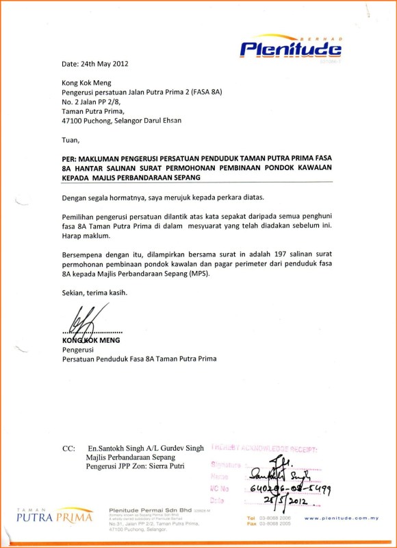 100% Phase 8A 197 unit owner signatures petition for the erection of guard house and perimeter fencing to the YDP MPSepang and received on behalf by Councillor Mr Santokh Singh (letter prepared by developer)