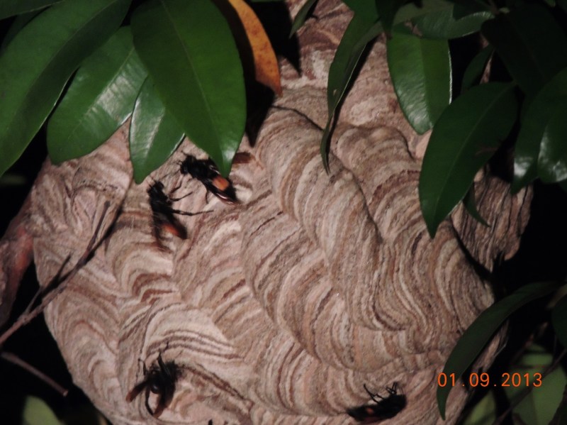 Hornet nest almost the size of basketball, photo taken just before torching fire.